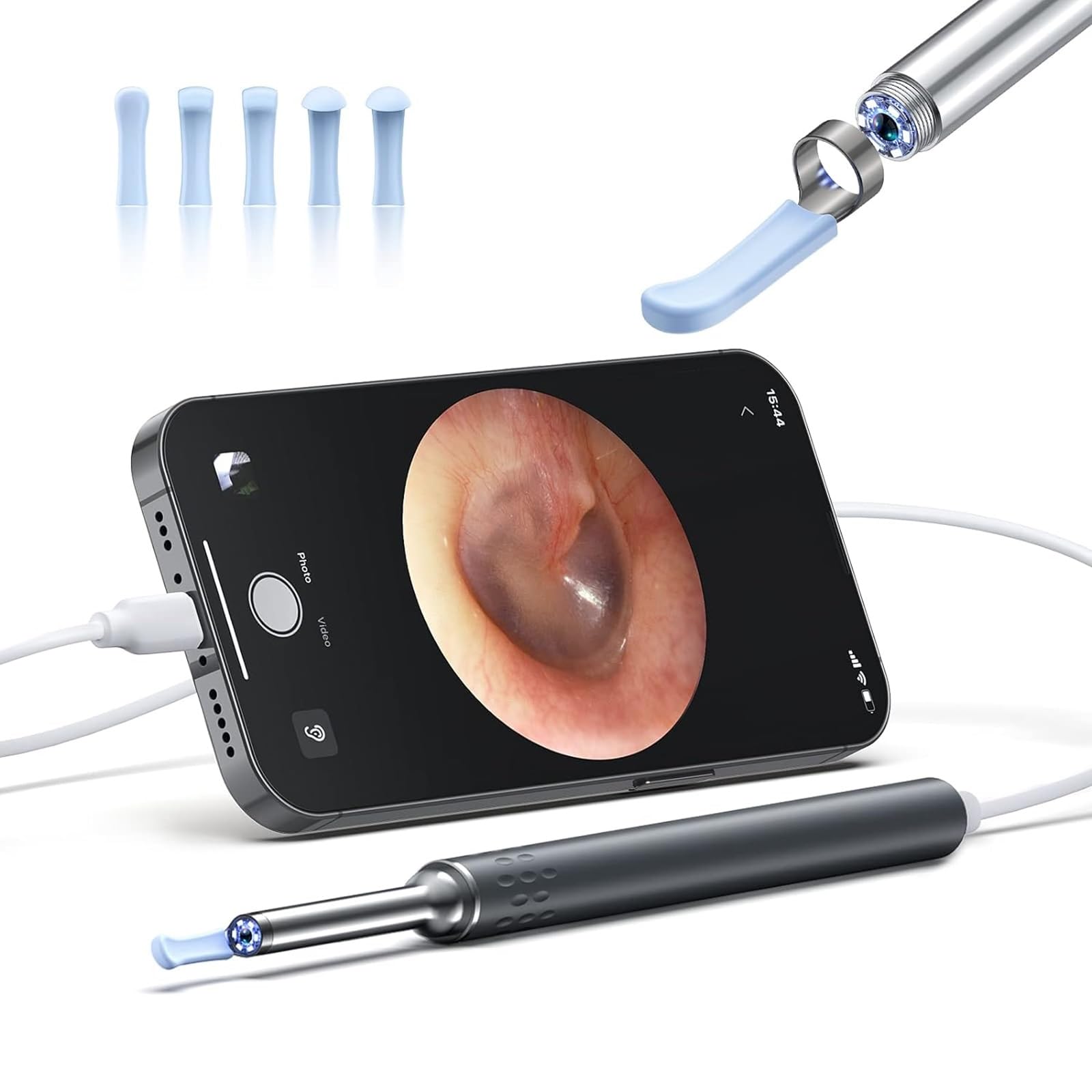 - 【Photos & Videos】This digital otoscope supports taking photos and videos on your device through the APP, you can save the photos/videos and send them to your doctor for a quick and easy professional consultation. The 6 LED-light HD otoscopes around the perimeter of this probe lens will give you a clear and wide field of vision that illuminates the dark crevices in the ear canal, nasal cavity or mouth. To ensure safety, the probe includes a heat sink and temperature control to prevent the probe from getting too hot.
